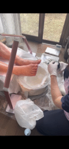 拭き取りながら、爪周りの各位sつ状況、爪の長さ、爪の形、足の裏などを観察します。